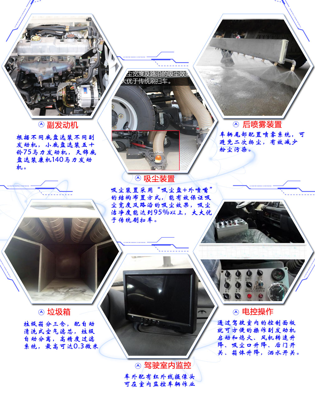 5、除尘效果好:收集入箱体的垃圾经过多次集尘,通过重力尘降、惯性除尘等多阶段可以实现颗粒和粉尘的分离,真正实现吸得起留得住)。加装喷洒水装置,过滤系统杜绝二次扬尘。