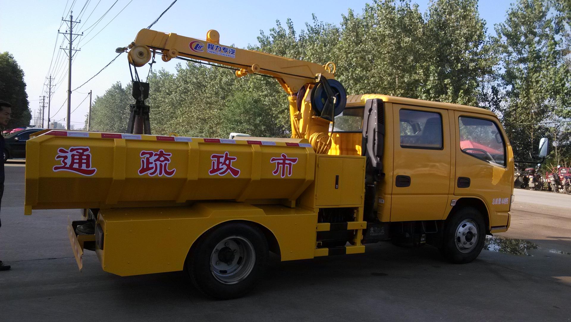 上装:部位有主臂升降、主臂旋转、抓斗抓放、绳管卷绕、翻斗升降、车身支承等装置。整车所有装置,由清淤车的柴油发动机提供动力,经取力器驱动油泵、油压马达、油缸、伐门等液压传动系统进行工作,该车一个人可轻松操作,实现机械化掏挖、提取、装车并卸载从窨井中抓取的污物。