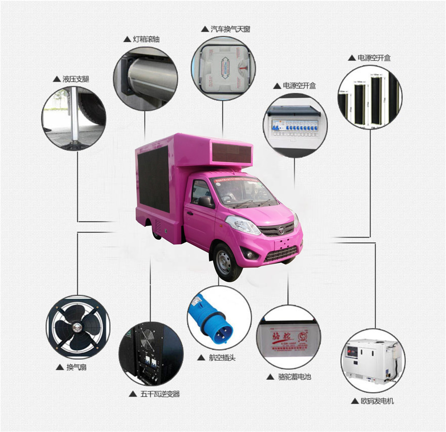 单面(一侧LED屏幕、一侧玻璃滚轴)或双面LED屏幕(P6/P5/P4),尾部单色LED屏幕,翼虎汽油发电机(6.5kw/8kw)或蓄电池供电系统加220V外接电源,电瓶,逆变器,车厢前面前排气扇2个,吸顶排气天窗1个,中控系统(电脑显示器、电脑主机、广播级功放、4个防水音柱、航空外接电源接头、30米外接电源线),豪华木地板/豪华铝地板,易损件(一块LED屏、一块电源、长短5条快速接头电源线)