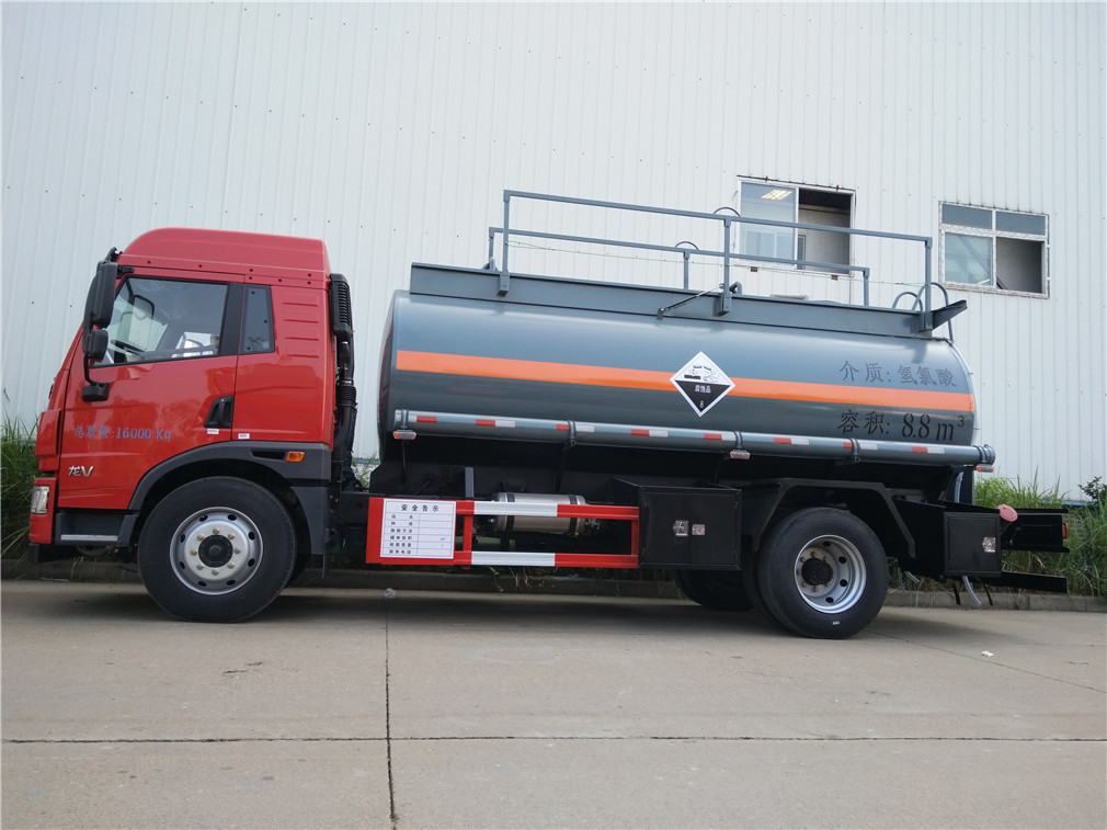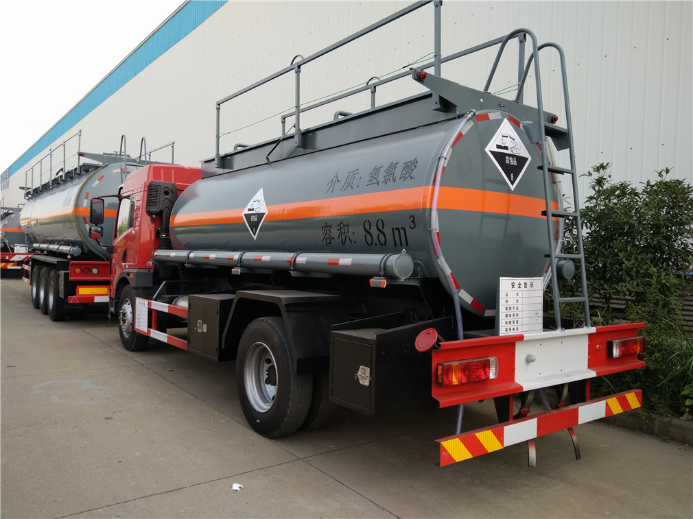 其他 该车适用于危险品运输。运输介质品名:次氯酸钠,液碱,氢氯酸,硫酸,氨水,密度分别为:1050千克/立方米,1040千克/立方米,1047千克/立方米,1045千克/立方米,990千克/立方米;类项号:8;罐体有效容积:8.8立方米,罐体外形尺寸(长×直径)(mm):5200×1600。随底盘选装平顶驾驶室。防护材料:Q235A碳钢,连接方式:左右侧面及后部防护均采用焊接连接,后部防护断面尺(mm):140×50, 后部防护离地高度(mm):450。仅采用底盘子午线轮胎型号(9.00R20 16PR,10.