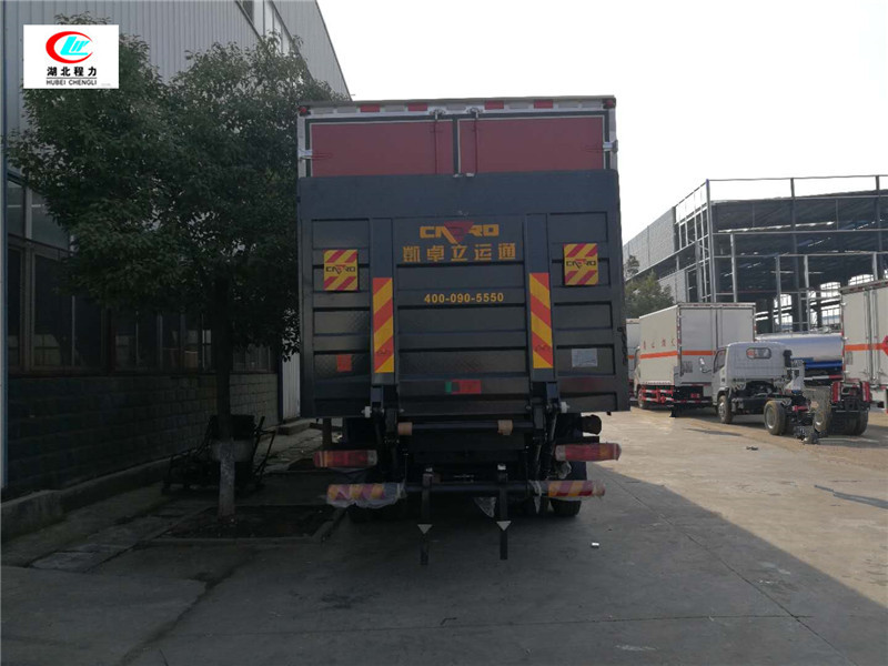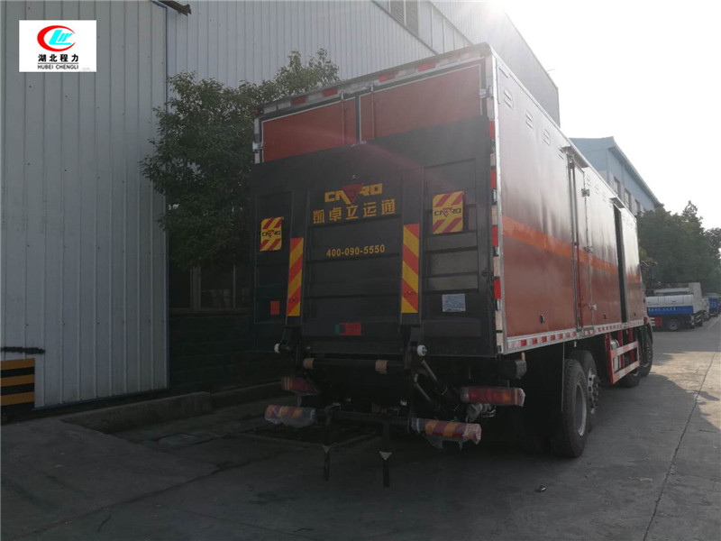 4mm厚的钢板制作,厢体底部铺有防静电胶皮,厢体两侧安装固定货物卡槽或卧环,厢体顶部中间位置安装烟雾报警器,后门及侧门安装防盗报警器,厢体前面铺静电胶皮,带侧门,后双门,厢体颜色根据客户要求变换,带两只灭火器和排气管防火罩、三角危险品顶灯,其余标配。