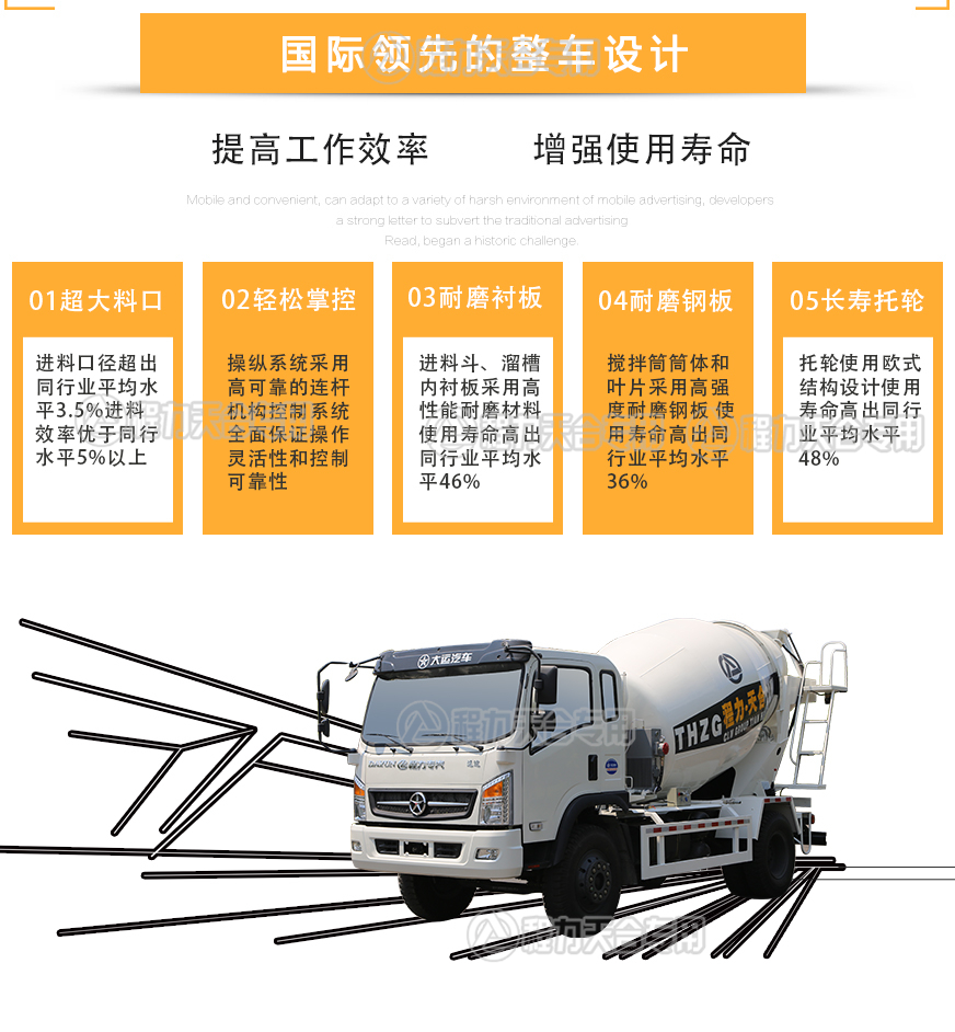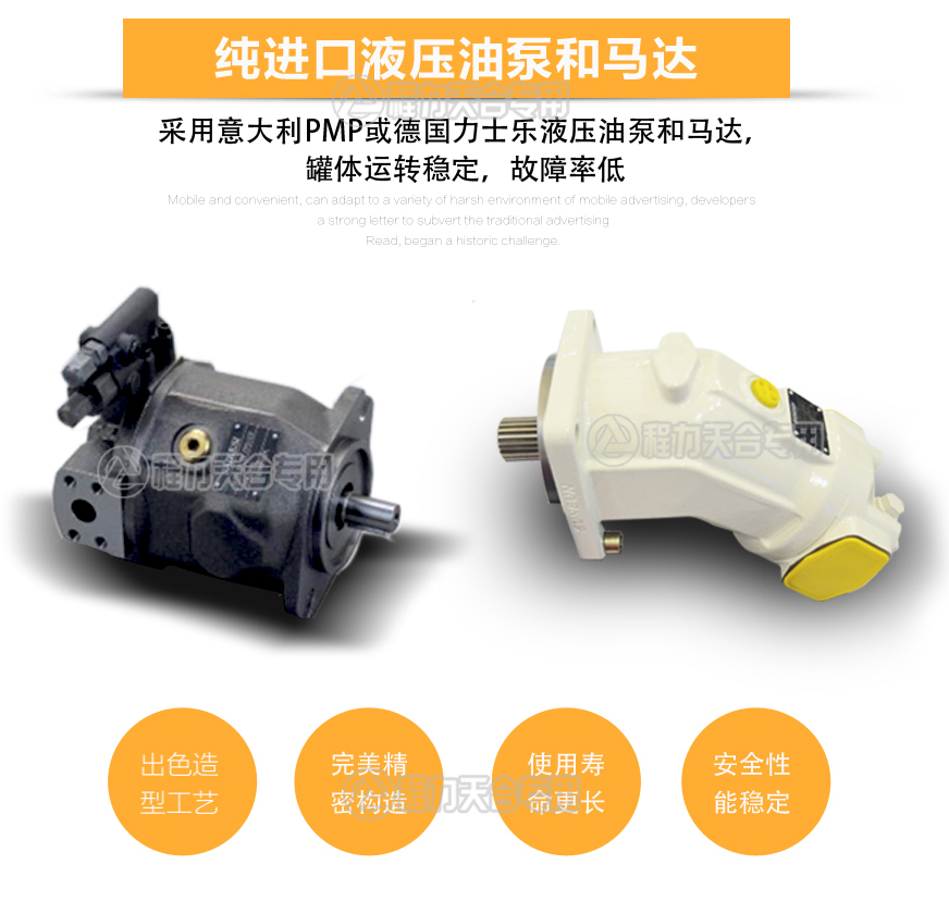 搅拌车液压系统: 全部采用国际知名液压系统,罐体运转更稳定,卸料速度更快,残留率低!